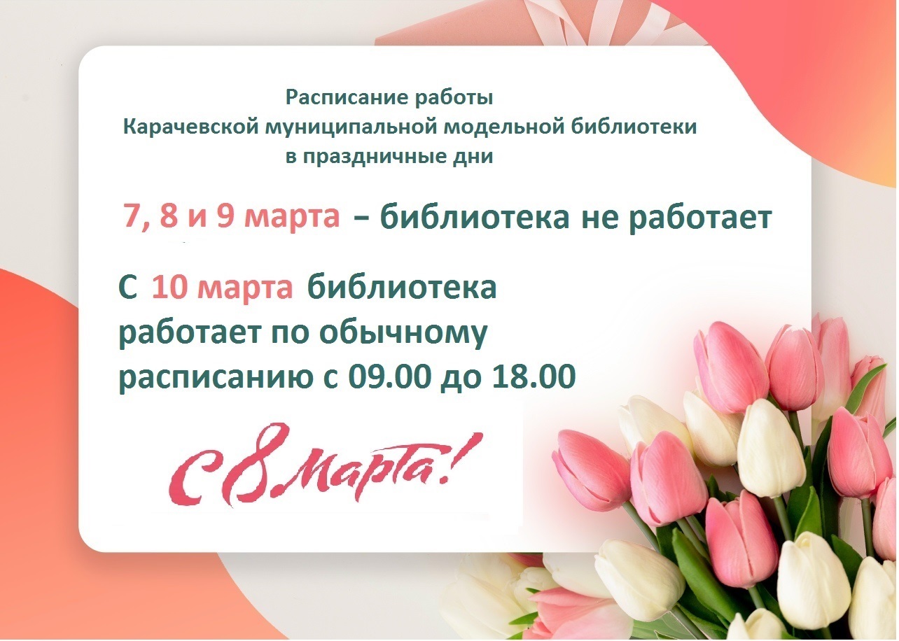Благодарим работников Карачевской библиотеки за помощь в выборе книг и вежливое отношение, и проведение интересных мероприятий для детей нашего города! Желаем успехов и больше замечательных книг! Ходим всей семьей, и мои сыновья с удовольствием идут в библиотеку!