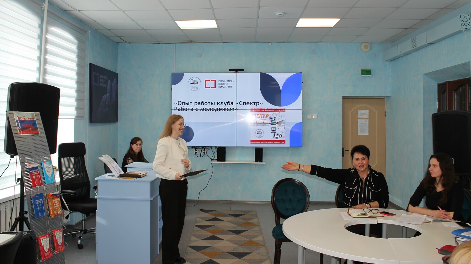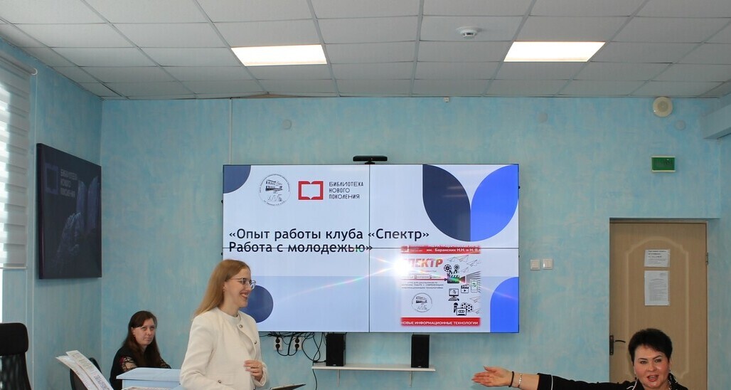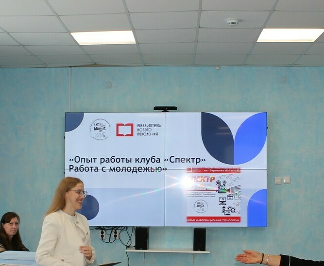 А. Г. Андриясова, главный библиотекарь читального зала представила увлекательную презентацию о работе библиотечного молодежного клуба «СПЕКТР». Доклад Анастасии Геннадьевны был содержательным и включал в себя множество аспектов и рекомендаций по работе с подростками, привлечению участников клуба к разным формам деятельности, в том числе видеосъемке, видеоредактированию и монтажу.