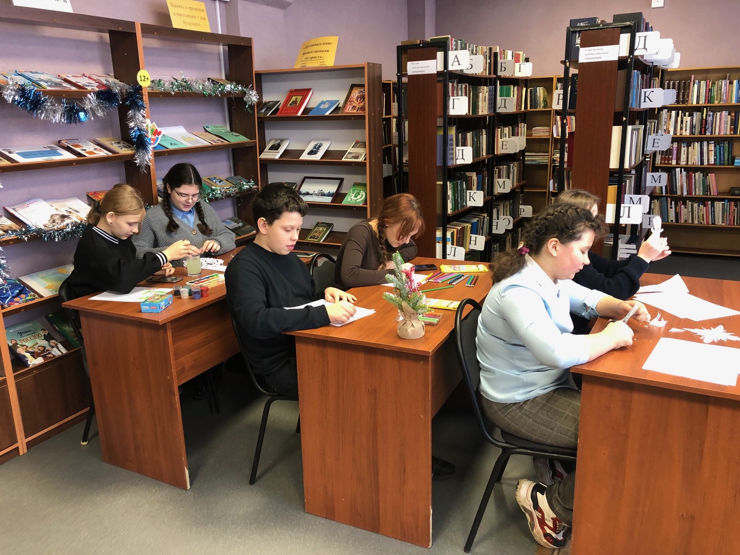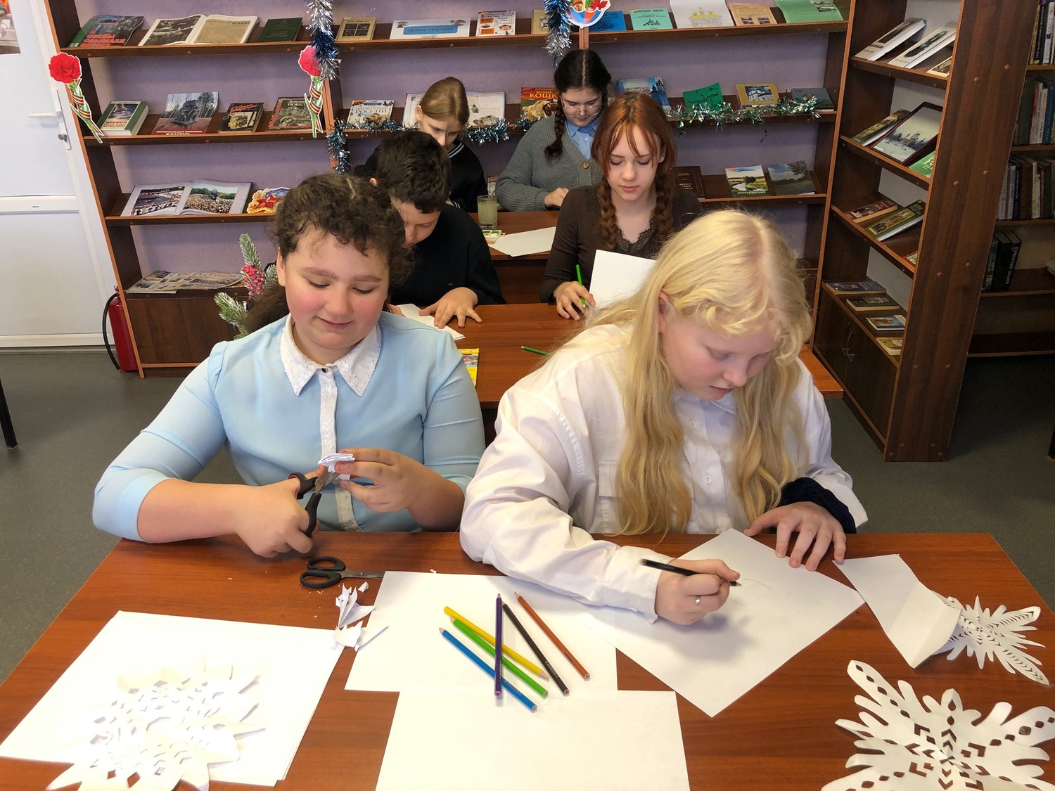 Затем вооружившись кисточками, красками, клеем, цветной бумагой, фломастерами, блестками, проявив всю свою фантазию ребята принялись за изготовления украшений для зала библиотеки и рисовали рисунки с изображением зимы. Атмосфера радости, веселья, и дружеского общения царила в библиотеке, украшения получились разные не похожие друг на друга. В завершении мероприятия библиотекарь поздравила всех участников с наступающим Новым годом! И пожелала крепкого здоровья, творческих успехов, и исполнение всех пожеланий в Новом году.