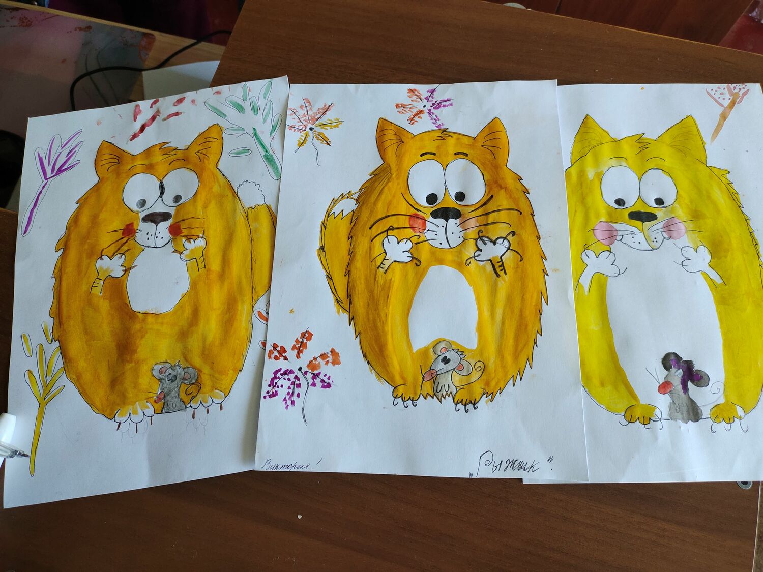 Сначала участники рисовали наброски, затем приступили к использованию акварельных красок. Разнообразные цвета и техники смешивания добавили яркости и выразительности каждому произведению. Дети с восторгом экспериментировали, создавая милых котиков с пушистыми шёрстками и игривыми взглядами. Звуки шуршания бумаги и легкие смешки создавали ощущение дружеского общения.