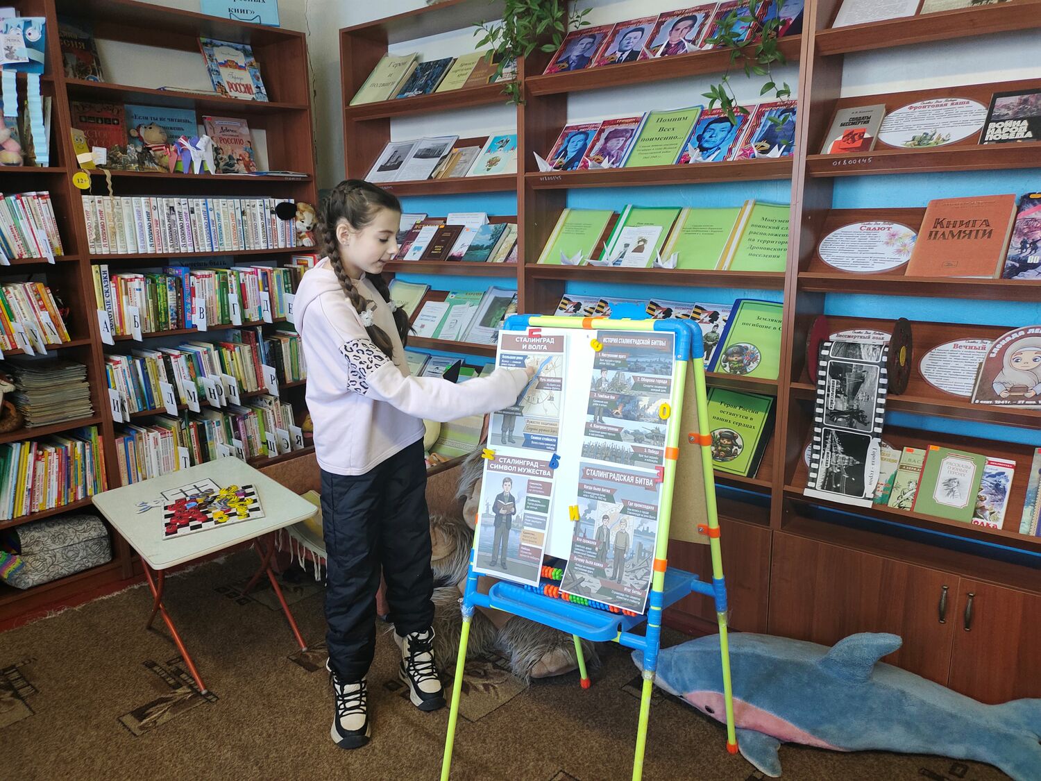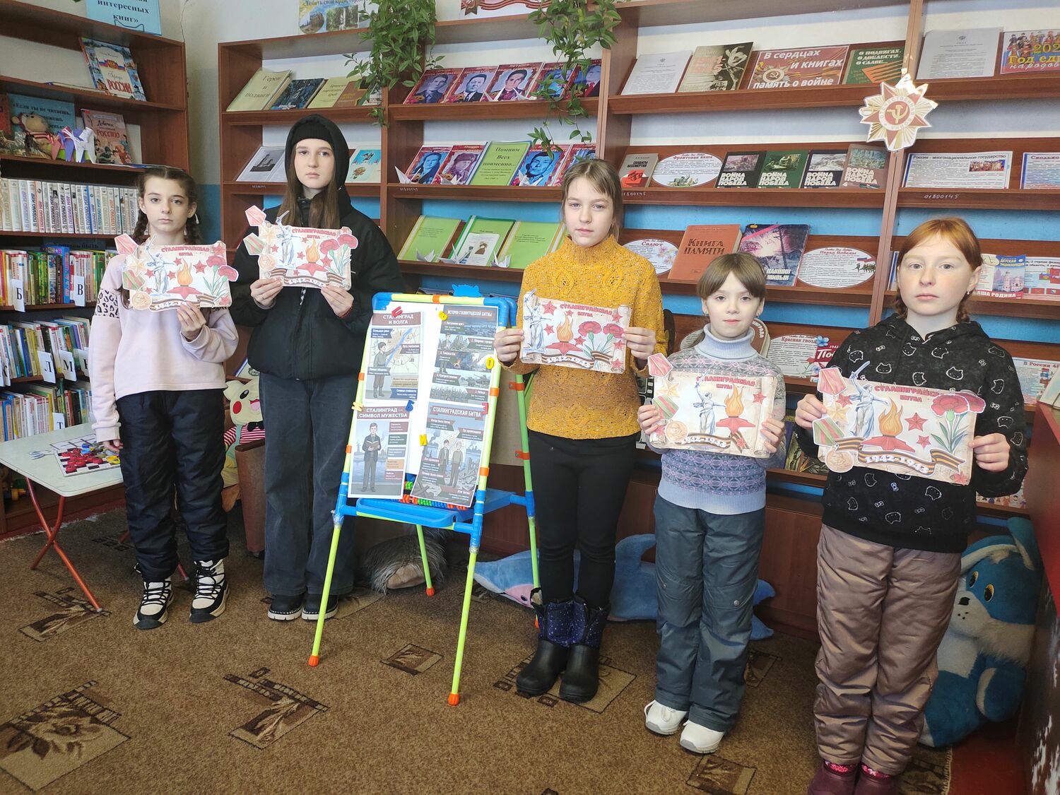 Заведующая библиотекой подготовила ключевую информацию о Сталинградской битве, изложенная доступно и понятно для юных слушателей на информационном стенде, выбрав самые важные моменты, избегая излишней сложности и тяжести, чтобы сделать рассказ доступным и понятным для ребят.
