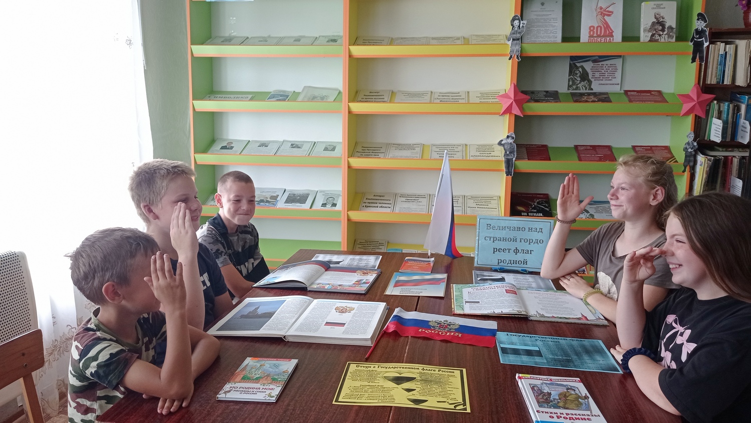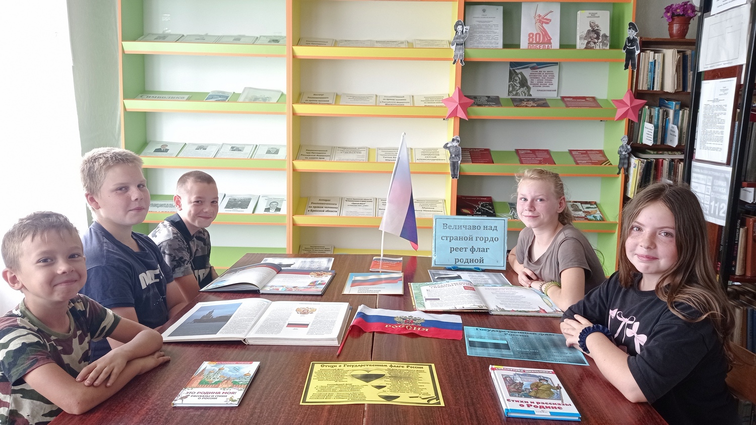К мероприятию также была подготовлена книжная выставка «Величаво над страной гордо реет флаг родной», где дети познакомились с литературой, посвященной государственной символике.