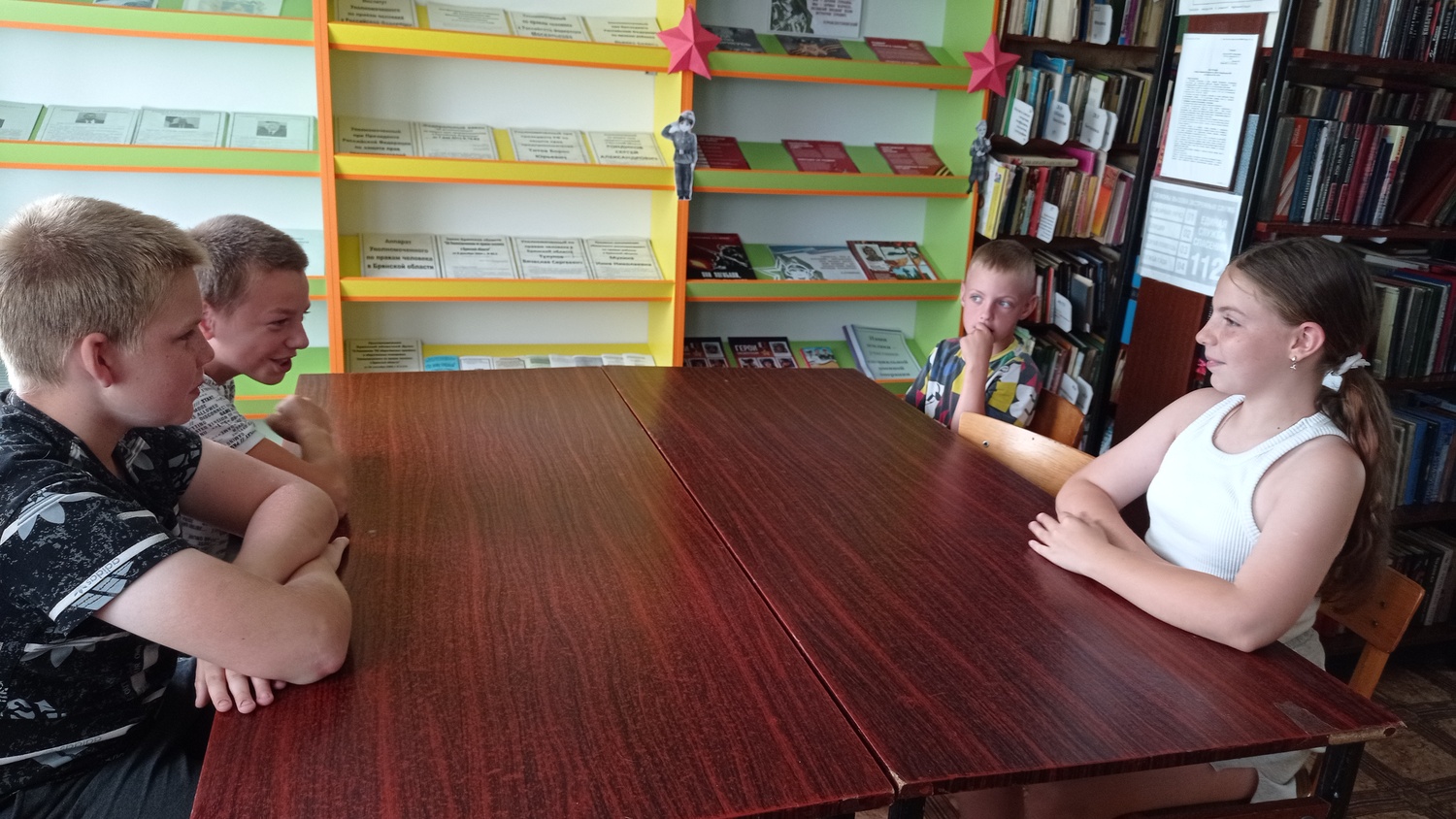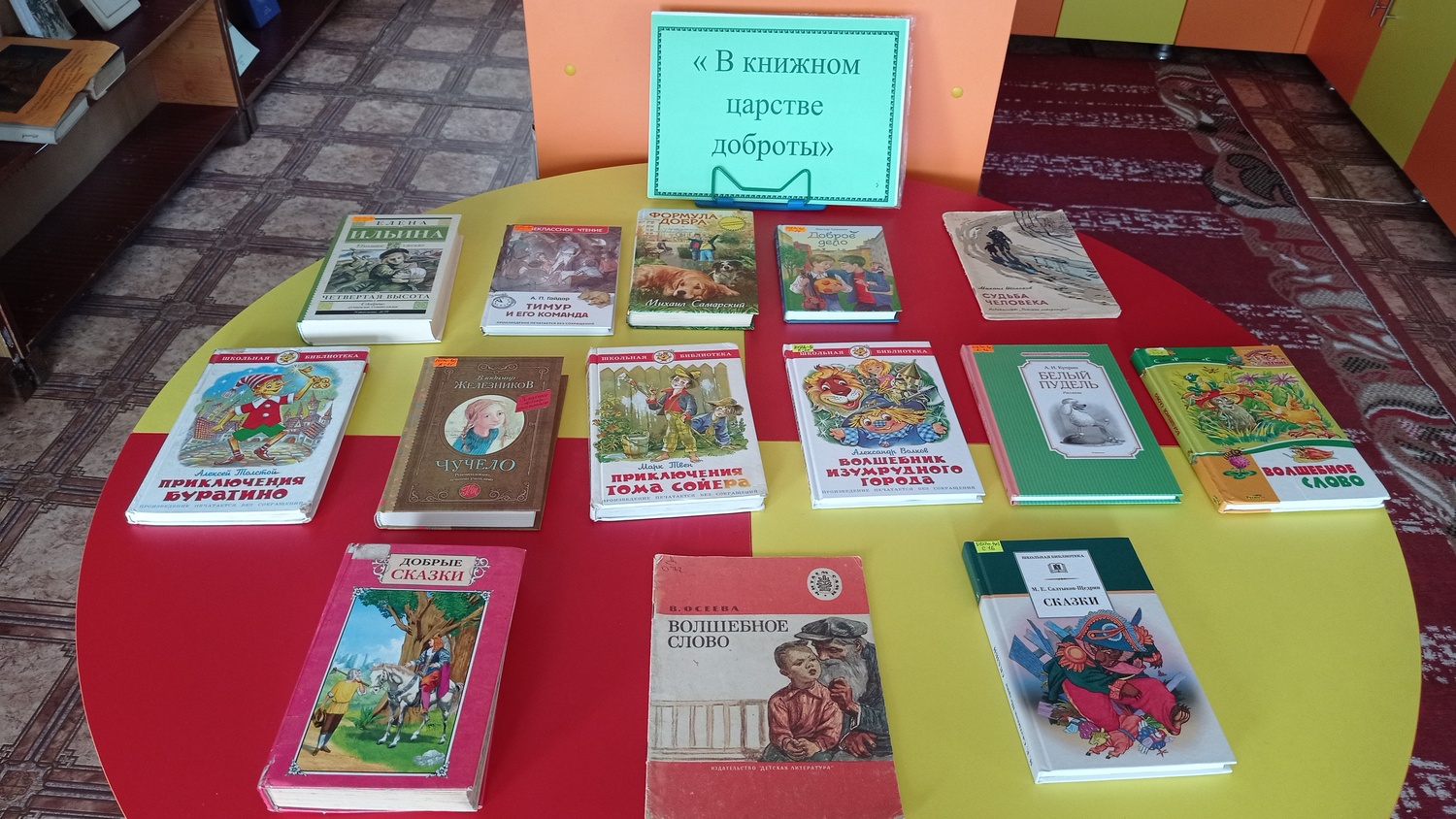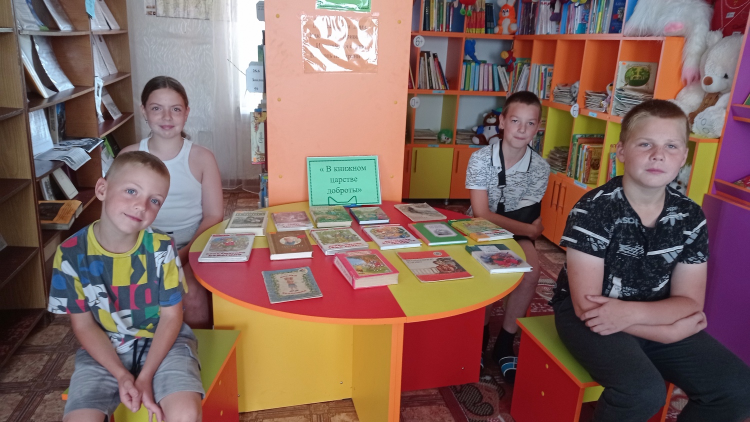 Библиотекарем была оформлена книжная выставка «В книжном царстве доброты», где ребятам было предложено познакомились с такими книгами как «Тимур и его команда» А. Гайдара о добрых, смелых справедливых и честных мальчишках и девчонках, верных своим идеалам, «Формула добра» М. Самарского о собаке-поводыре Трисоне, «Белый Бим Чёрное ухо» Г. Троепольского, «Судьба человека» М. Шолохова, «Доброе дело» В. Трынкина и др.
