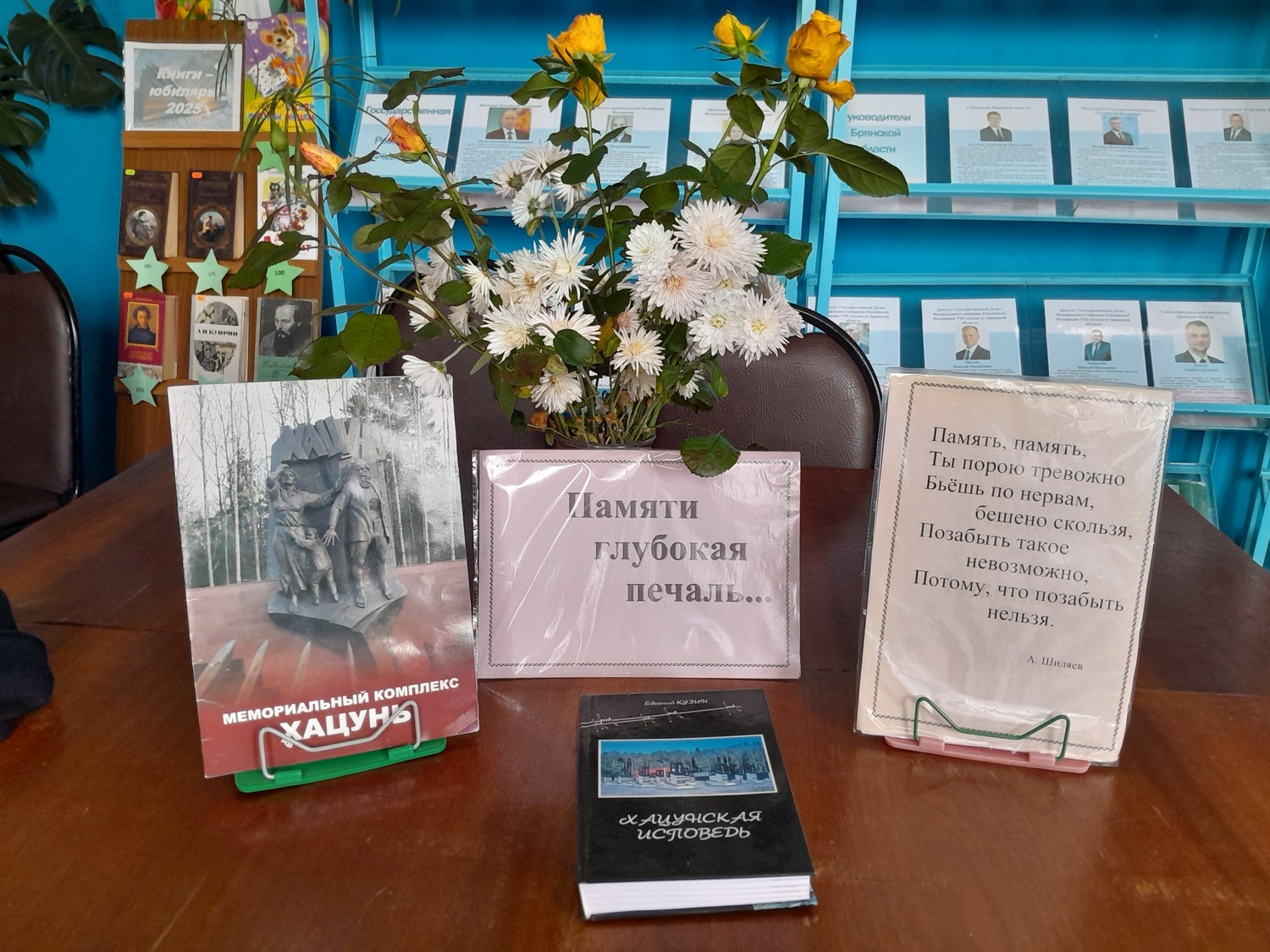 В память о жертвах фашизма на месте хацунской трагедии создан мемориальный комплекс Хацунь, включающий здание музея, гранитные стелы по числу районов Брянской области, стену Скорби, могилу мирных жителей, братскую могилу красноармейцев и часовню.