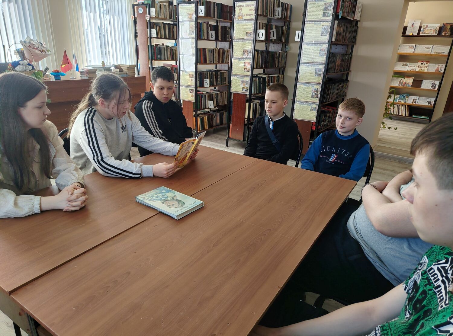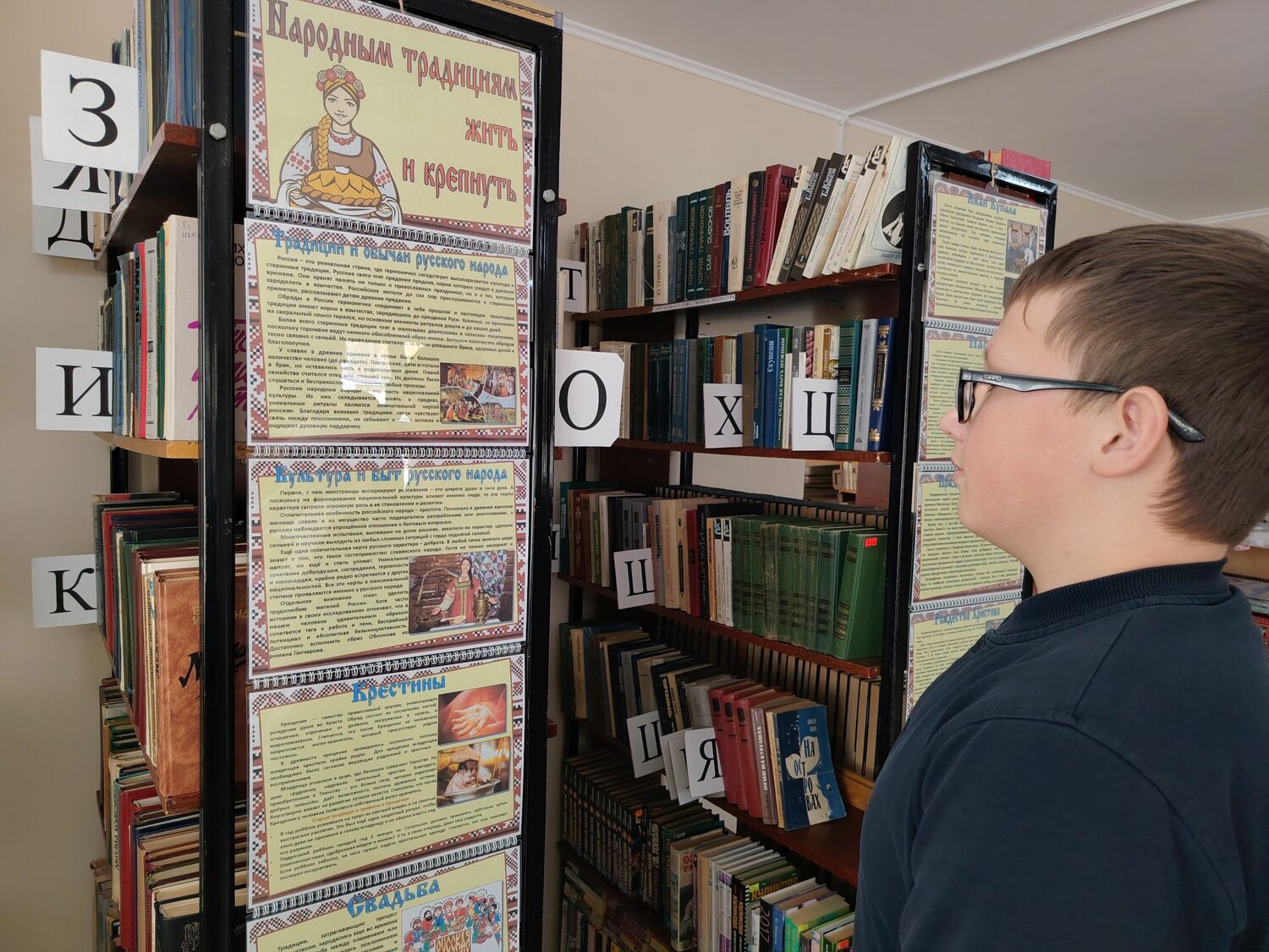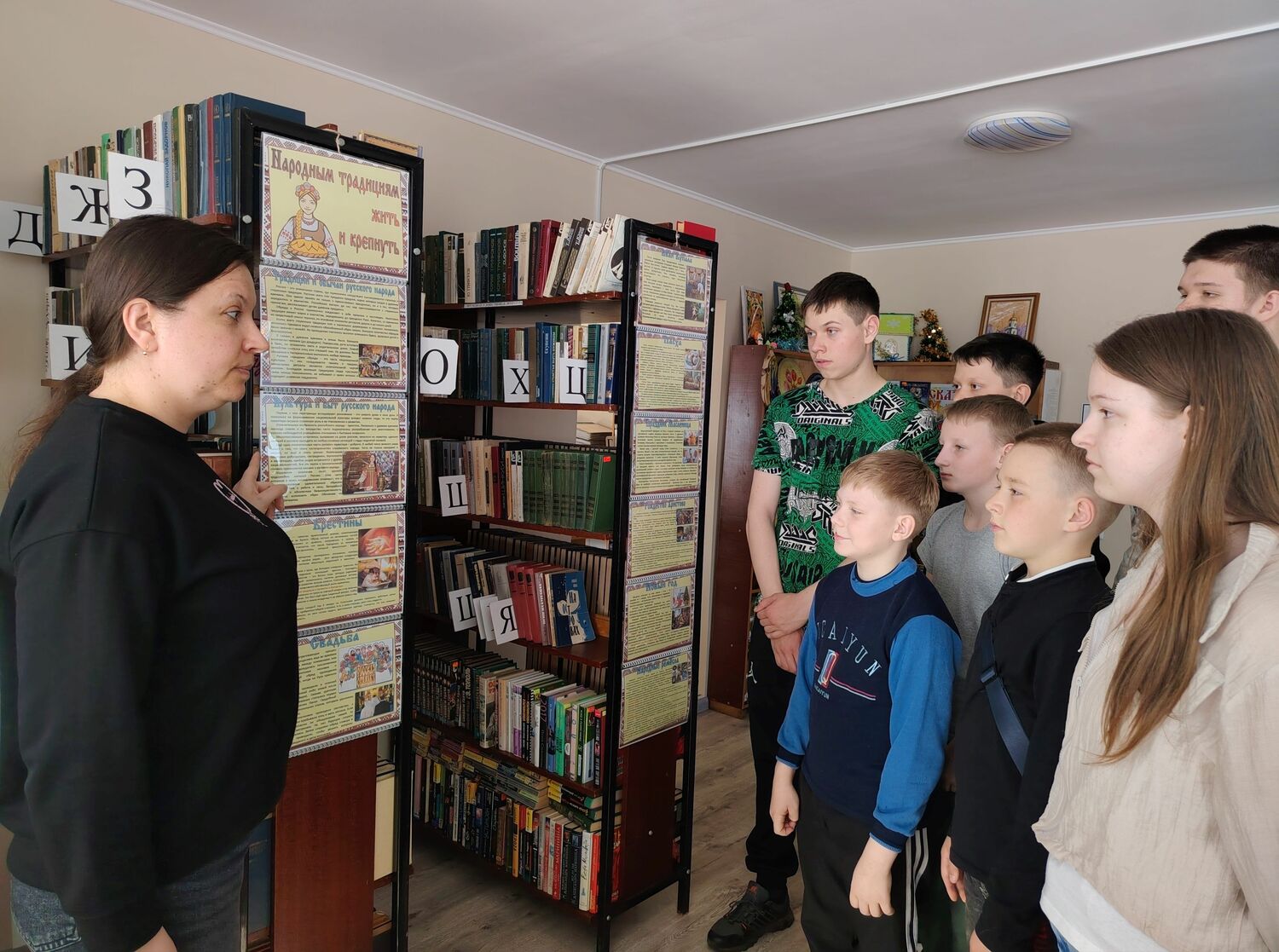 Мероприятие сопровождалось обзором книжной выставки «Народным традициям жить и крепнуть» и чтением отрывков – описаний традиций и обычаев, которые встречаются в произведениях русских классиков.