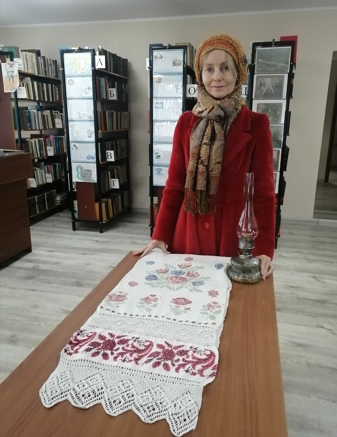 Читательница библиотеки Наталья Николаевна подарила удивительные вещи — стеклянную керосиновую лампу и рушник из семейной коллекции. Керосиновая лампа — это не просто источник света, а символ уюта, трудолюбия и тех вечеров, когда семья собиралась вместе за разговорами. Рушник с вышивкой — это настоящее произведение искусства. Им украшали красный угол в доме, использовали в самых важных моментах жизни — от встречи дорогих гостей до свадебных обрядов.