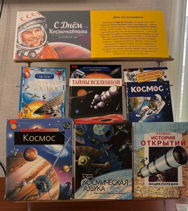 На выставке представлена литература о космосе, галактиках, звездах, планетах Солнечной системы. Читатели могут ознакомиться с книгами о Юрии Гагарине, которого знает вся планета, о космонавтах – наших земляках – Андрияне Николаеве, Николае Бударине и Мусе Манарове. Из книжных изданий читатели также узнают об истории создания первых космических станций, о том, как проходят подготовки к полётам, чем питаются космонавты в невесомости и какие качества нужны человеку для того, чтобы отправиться к звёздам. Библиотекарь подготовила вопросы об истории космонавтики.