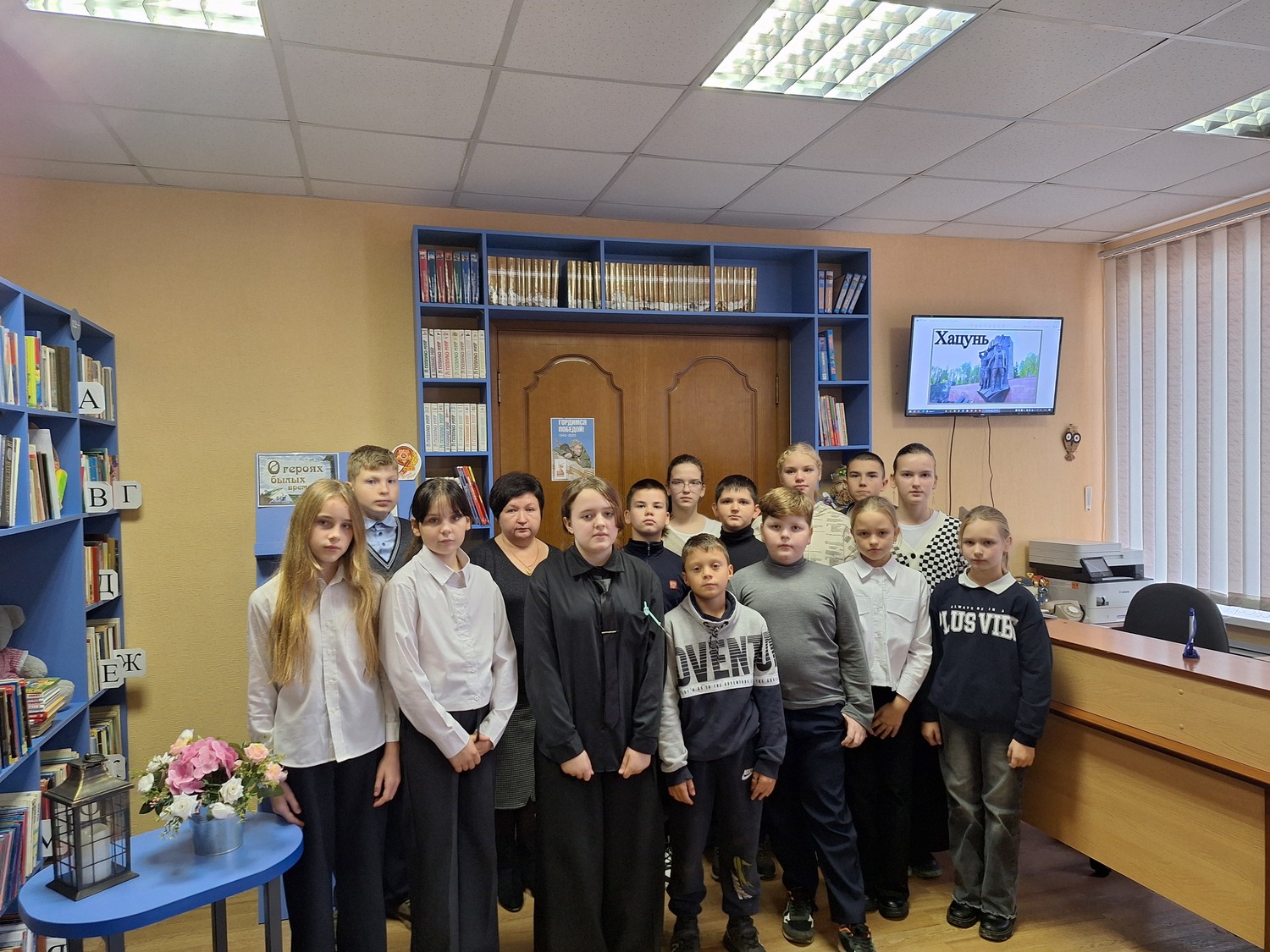 Ребята совершили виртуальную экскурсию по мемориальному комплексу «Хацунь». В ходе мероприятия была показана презентация «Хацунь», буктрейлер по стихотворению Е. П. Кузина.