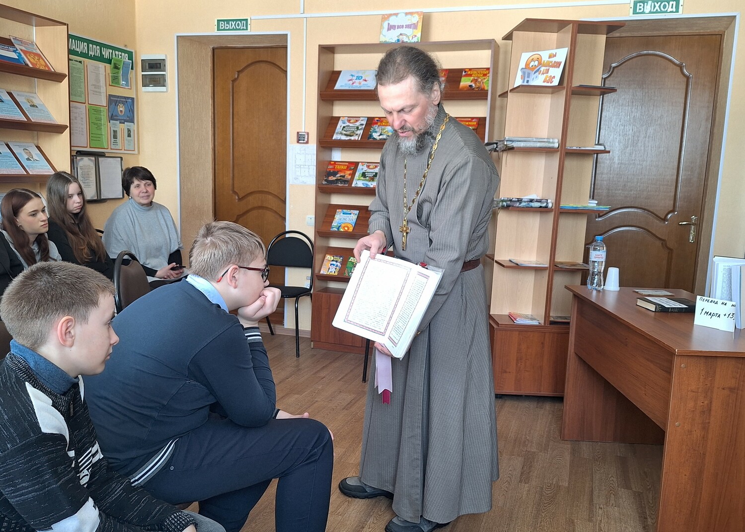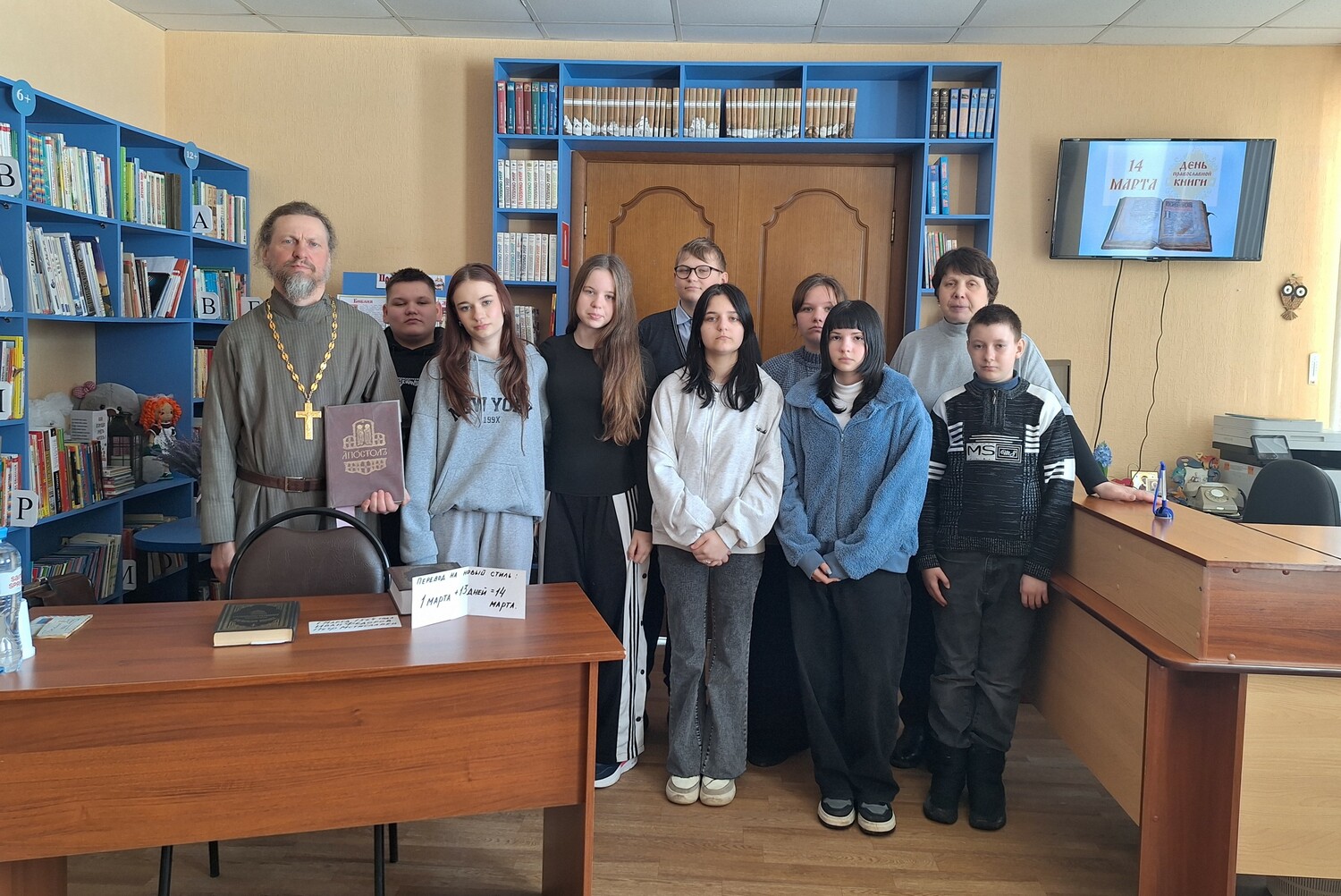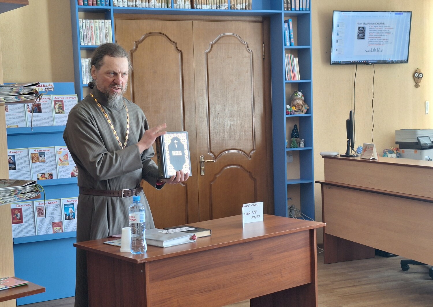 Отец Вячеслав поздравил всех присутствующих с праздником и отметил, что Книга — великий дар человеку от Бога. Познакомил с историей праздника, с историей выпуска первой печатной православной книги «Апостол», с именем первопечатника Ивана Федорова.