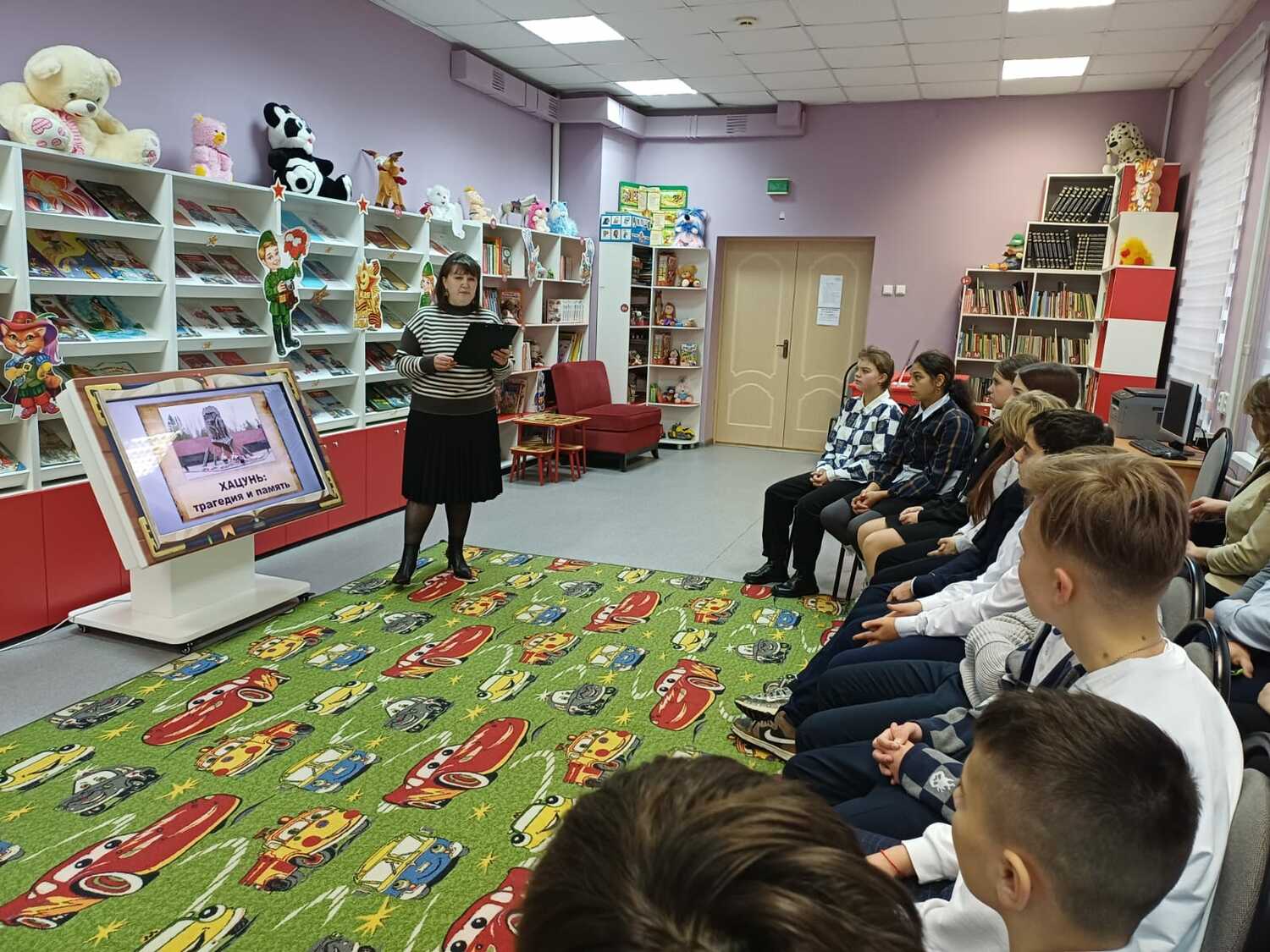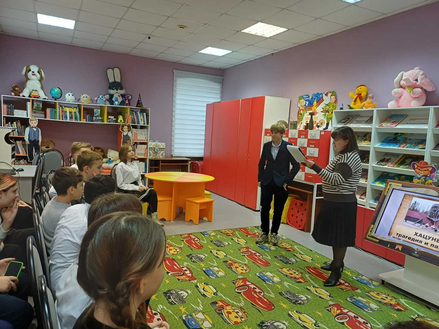 В память об этих страшных событиях начала Великой Отечественной войны для учеников 7 класса средней школы имени С.П. Лоскутова прошел патриотический час «Скорбный звон Хацуни». Школьники познакомились с презентацией и видеоматериалами о трагедии деревни, приняли участие в исторической викторине и поделились своими мыслями о тех далёких и скорбных днях.